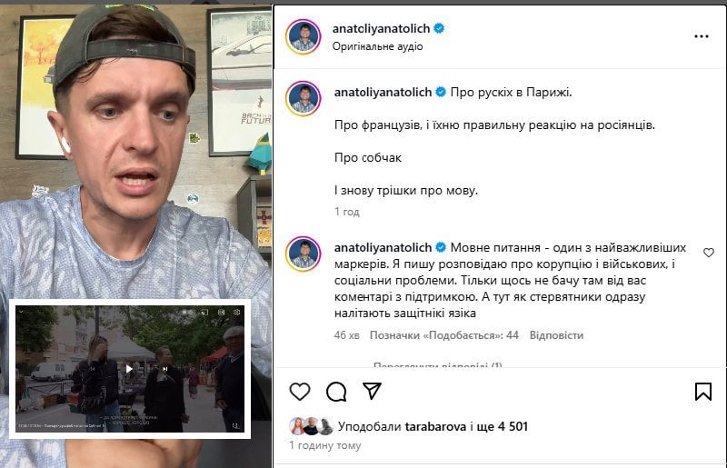 Анатоліч також підняв тему мови серед українців за кордоном. Він навів приклад, що саме мовлення стає головним маркером, за яким іноземці визначають національність людини. Тож закликав співвітчизників задуматися, якою мовою вони користуються у щоденному житті та в публічному просторі.