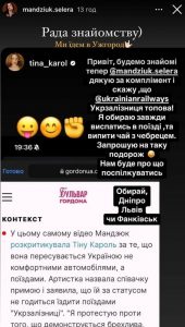 Тіна Кароль опублікувала в себе в сторіз відповідь Мандзюк. Очевидно, виконавиця погодилася.