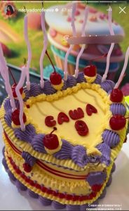 Проте й це було не все. Знаменитості для іменинниці та її друзів влаштували справжню казку. Вони замовили аніматорів, які провели для дітей різноманітні конкурси. Зокрема, Надя показала, як Саша била піньяту із сюрпризами. А опісля дівчинка у колі друзів поласувала смачним за задекорованим квітами столом. Крім того, задула свічки на яскравому тортику.