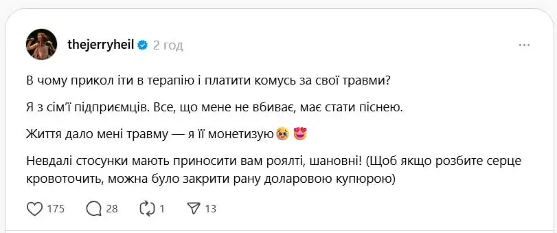 У Threads співачка зазначила, що не вважає доцільним витрачати гроші на терапію та розповідати психологу про власні травми. На її думку, будь-який біль чи розчарування слід трансформувати у творчість. Крім того, Jerry Heil підкреслила, що «шрами» від невдалих стосунків можна «залатати» хоча б грошима, аби отримати з цього бодай якусь користь.