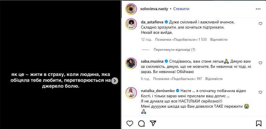 - “Настя… Я спочатку побачила відео Кості й тільки зараз мені прислали ваш допис. Я не думала, що все настільки серйозно! Мені дуже шкода, що Вам довелося таке пережити” – Наталка Денисенко