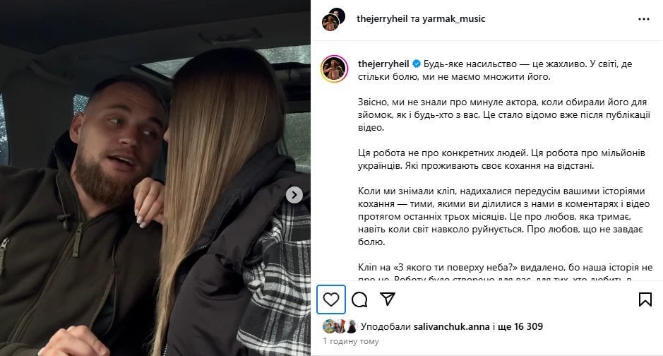 “Будь-яке насильство — це жахливо. У світі, де стільки болю, ми не маємо множити його. Звісно, ми не знали про минуле актора, коли обирали його для знімань, як і будь-хто з вас. Це стало відомо вже після публікації відео. Ця робота не про конкретних людей. Ця робота про мільйонів українців, які проживають своє кохання на відстані. Кліп до пісні “З якого ти поверху неба?” видалено, бо наша історія не про це. Роботу було створено для вас, для тих, хто любить в умовах сьогодення, тому ми хочемо цю пісню цілком і повністю вам присвятити! Ми змонтуємо кліп про вас!” – йдеться у заяві YARMAK і Jerry Heil в Instagram.