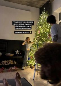 На знімках видно, як родина разом вішає іграшки на велику зелену ялинку, яка сягає майже стелі та прикрашає вітальню їхнього будинку. Даша розповіла, що донька з особливим ентузіазмом поставилася до цього процесу та навіть сфотографувала кожен елемент декору, щоб поділитися з однокласниками.