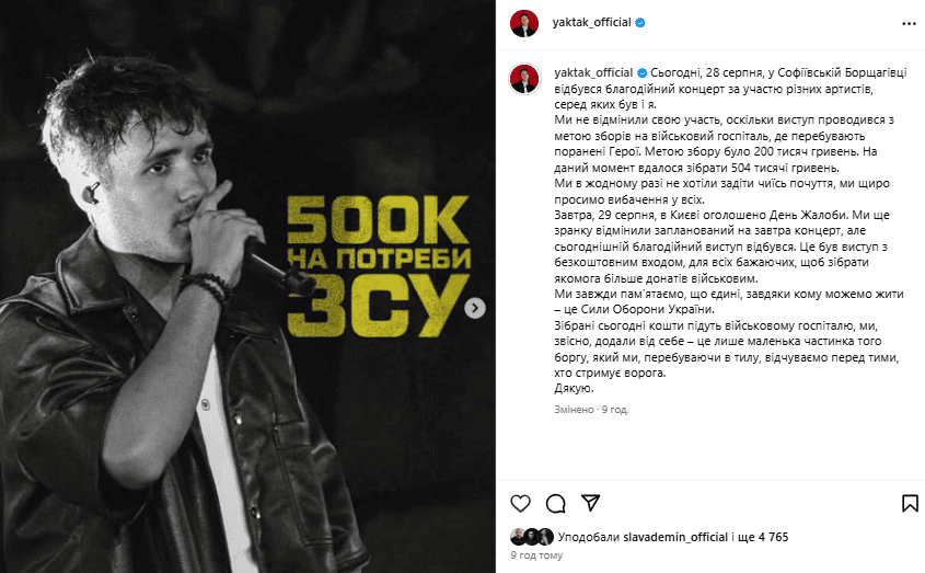 Іvan Navi відмовчався, а от YAKTAK прокоментував скандальний концерт у день обстрілу Києва. Співак пояснив, що виступ був благодійним і мав на меті зібрати 200 тисяч гривень для військового госпіталю. За його словами, завдяки концерту вдалося зібрати аж пів мільйона гривень.